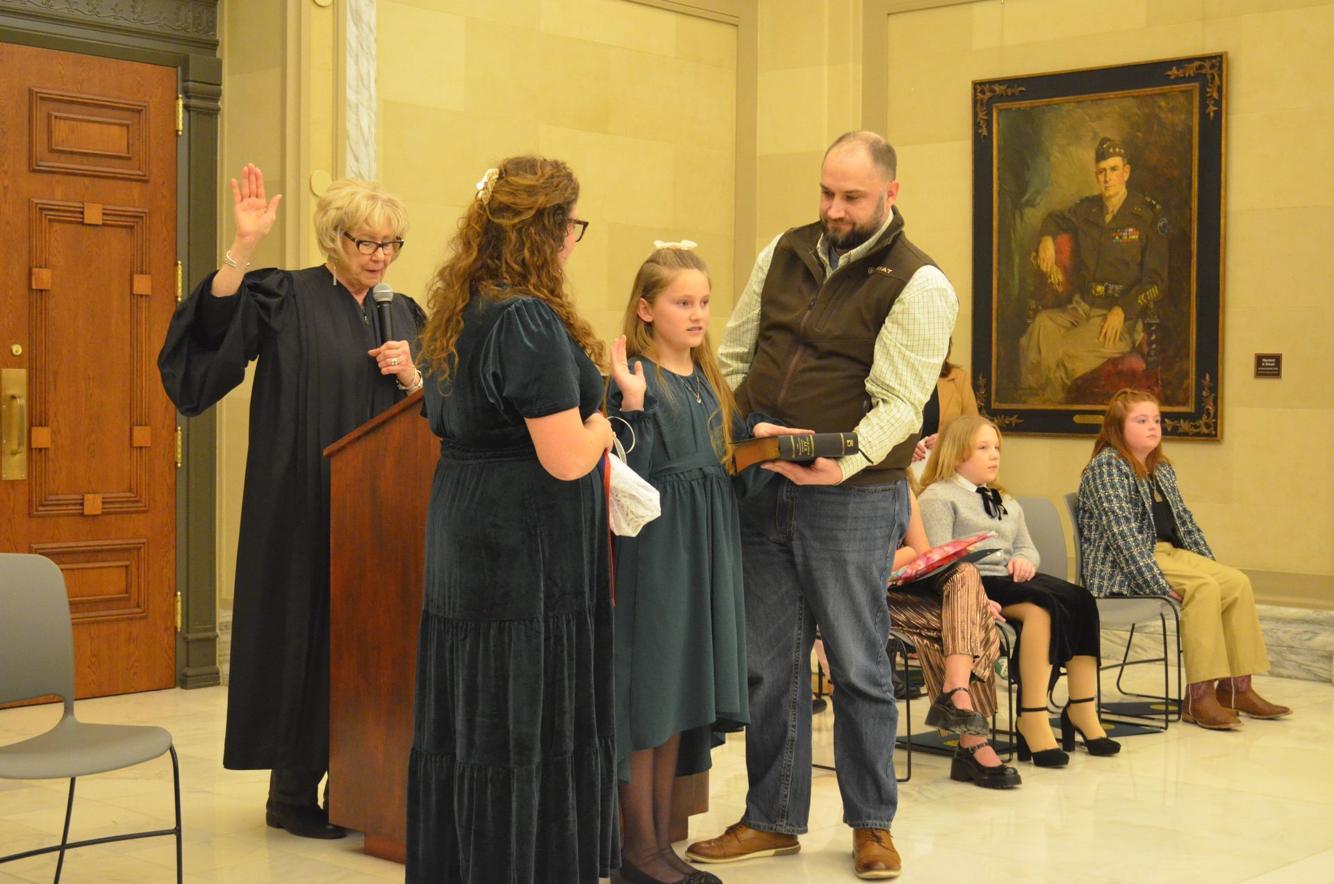 Riley Braden (center front) of Bristow takes the oath of office as Oklahoma’s 4-H Junior Governor for 2026 during a State Capitol ceremony on Mon., Feb. 2. Riley is joined by her parents, Forest and Jamie Braden, as she takes the oath. Oklahoma Supreme Court Justice Noma Gurich administered the oath. Courtesy Photo by OICA (Riley Braden 4-H YG 2026)